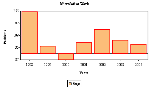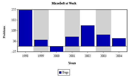 | String[] xAxisLabels= { "1998", "1999", "2000", "2001", "2002", "2003", "2004" }; String xAxisTitle= "Years"; String yAxisTitle= "Problems"; String title= "Micro$oft at Work"; DataSeries dataSeries = new DataSeries( xAxisLabels, xAxisTitle, yAxisTitle, title ); double[][] data= new double[][]{ { 250, 45, -36, 66, 145, 80, 55 } }; String[] legendLabels= { "Bugs" }; Paint[] paints= new Paint[]{ Color.blue.darker() }; BarChartProperties barChartProperties= new BarChartProperties(); AxisChartDataSet axisChartDataSet= new AxisChartDataSet( data, legendLabels, paints, ChartType.BAR, barChartProperties ); dataSeries.addIAxisPlotDataSet( axisChartDataSet ); ChartProperties chartProperties= new ChartProperties(); //---to make this plot horizontally, pass true to the AxisProperties Constructor //AxisProperties axisProperties= new AxisProperties( true ); AxisProperties axisProperties= new AxisProperties(); LegendProperties legendProperties= new LegendProperties(); AxisChart axisChart= new AxisChart( dataSeries, chartProperties, axisProperties, legendProperties, AxisCharts.width, AxisCharts.height ); |