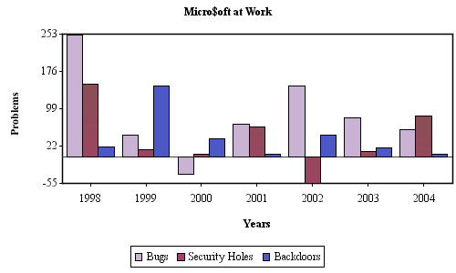 | String[] xAxisLabels= { "1998", "1999", "2000", "2001", "2002", "2003", "2004" }; String xAxisTitle= "Years"; String yAxisTitle= "Problems"; String title= "Micro$oft at Work"; DataSeries dataSeries = new DataSeries( xAxisLabels, xAxisTitle, yAxisTitle, title ); double[][] data= new double[][]{ { 250, 45, -36, 66, 145, 80, 55 }, { 150, 15, 6, 62, -54, 10, 84 }, { 20, 145, 36, 6, 45, 18, 5 } }; String[] legendLabels= { "Bugs", "Security Holes", "Backdoors" }; Paint[] paints= TestDataGenerator.getRandomPaints( 3 ); ClusteredBarChartProperties clusteredBarChartProperties= new ClusteredBarChartProperties(); AxisChartDataSet axisChartDataSet= new AxisChartDataSet( data, legendLabels, paints, ChartType.BAR_CLUSTERED, clusteredBarChartProperties ); dataSeries.addIAxisPlotDataSet( axisChartDataSet ); ChartProperties chartProperties= new ChartProperties(); //---to make this plot horizontally, pass true to the AxisProperties Constructor //AxisProperties axisProperties= new AxisProperties( true ); AxisProperties axisProperties= new AxisProperties(); LegendProperties legendProperties= new LegendProperties(); AxisChart axisChart= new AxisChart( dataSeries, chartProperties, axisProperties, legendProperties, AxisCharts.width, AxisCharts.height ); |