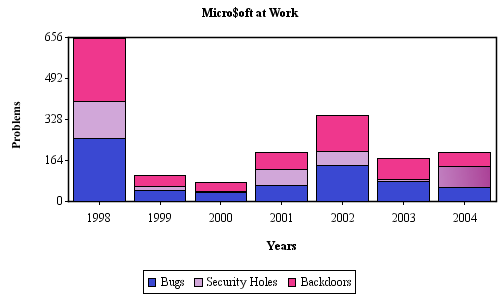 | String[] xAxisLabels= { "1998", "1999", "2000", "2001", "2002", "2003", "2004" }; String xAxisTitle= "Years"; String yAxisTitle= "Problems"; String title= "Micro$oft at Work"; DataSeries dataSeries = new DataSeries( xAxisLabels, xAxisTitle, yAxisTitle, title ); double[][] data= new double[][]{ { 250, 45, 36, 66, 145, 80, 55 }, { 150, 15, 6, 62, 54, 10, 84 }, { 250, 45, 36, 66, 145, 80, 55 } }; String[] legendLabels= { "Bugs", "Security Holes", "Backdoors" }; Paint[] paints= TestDataGenerator.getRandomPaints( 3 ); StackedBarChartProperties stackedBarChartProperties= new StackedBarChartProperties(); AxisChartDataSet axisChartDataSet= new AxisChartDataSet( data, legendLabels, paints, ChartType.BAR_STACKED, stackedBarChartProperties ); dataSeries.addIAxisPlotDataSet( axisChartDataSet ); ChartProperties chartProperties= new ChartProperties(); //---to make this plot horizontally, pass true to the AxisProperties Constructor //AxisProperties axisProperties= new AxisProperties( true ); AxisProperties axisProperties= new AxisProperties(); LegendProperties legendProperties= new LegendProperties(); AxisChart axisChart= new AxisChart( dataSeries, chartProperties, axisProperties, legendProperties, AxisCharts.width, AxisCharts.height ); |